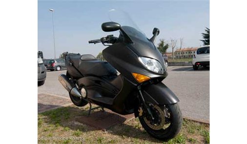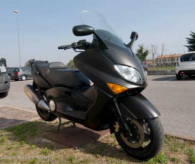 This T-max has been completely covered in matt black film, including mirrors, grab bars and fairings.